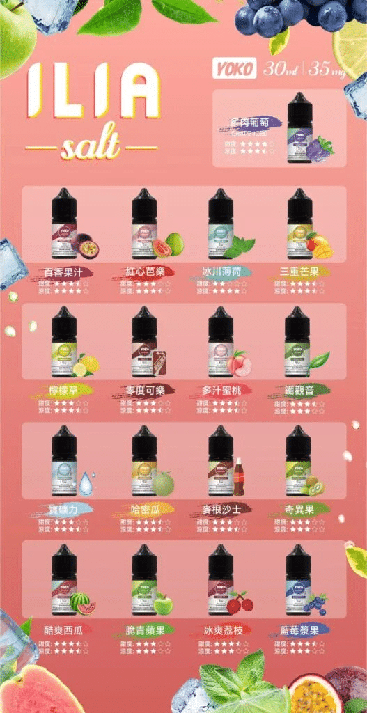 葡萄, 百香果, 芭樂, 薄荷, 鐵觀音, 哈密瓜, 沙士, 奇異果, 西瓜, 青蘋果, 荔枝, 藍莓, 芒果, 檸檬草, 可樂, 蜜桃, 寶礦力